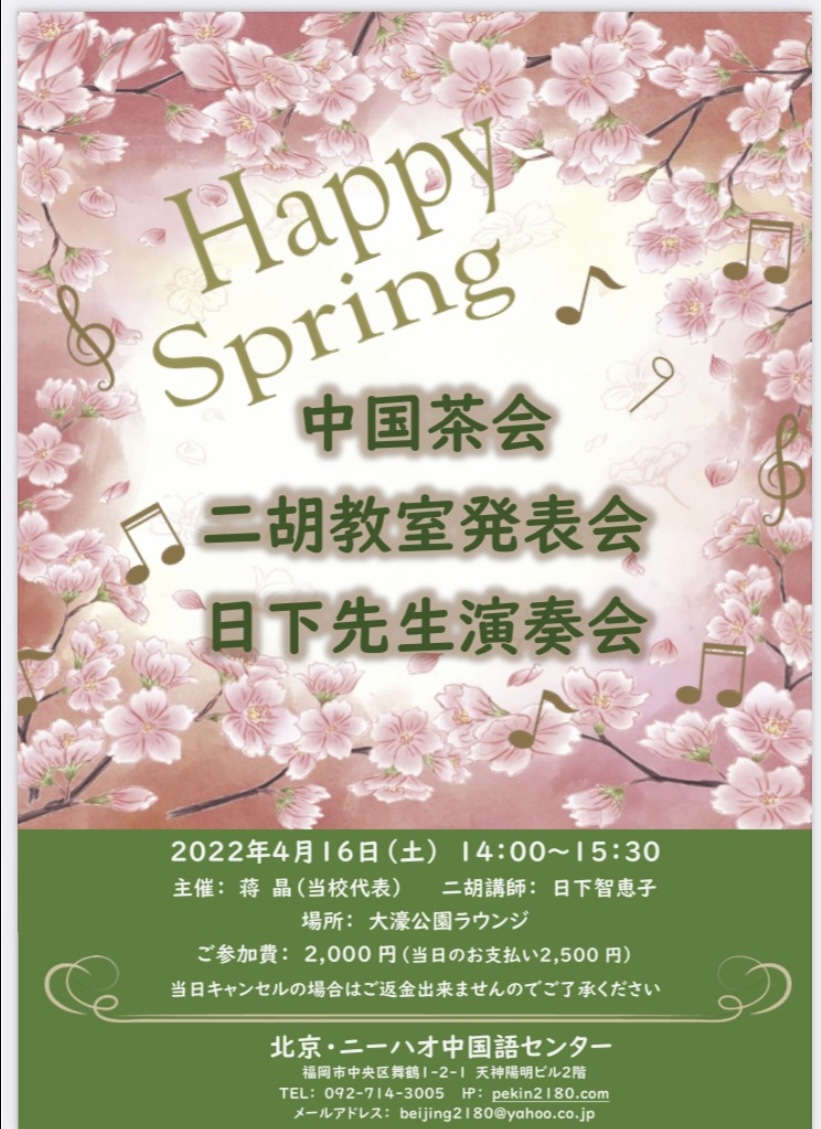 きたる4月16日土曜日に二胡教室発表会及び日下講師の演奏会を開催いたします。春風の中、二胡の音色を堪能しましょう!