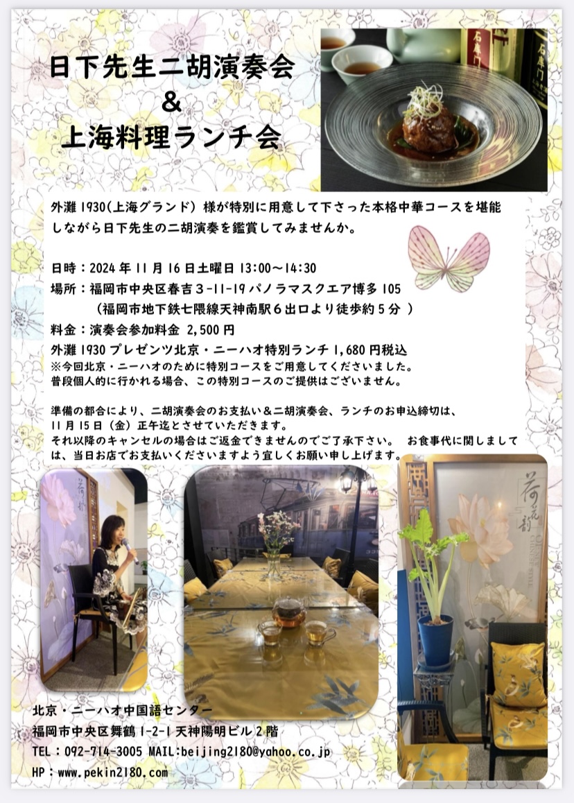 準備の都合により、二胡演奏会のお支払い&二胡演奏会、ランチのお申込締