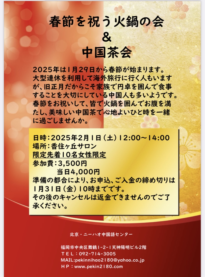 春節をお祝いして、皆で火鍋を囲んでお腹を満 たし、美味しい中国茶で心地よいひと時を一緒 に過ごしませんか