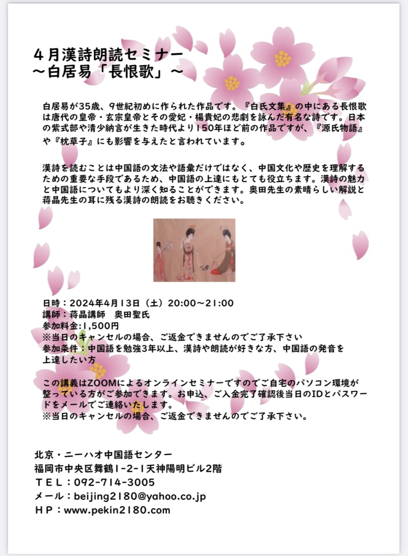 参加条件:中国語を勉強3年以上、漢詩や朗読が好きな方、中国語の発音を上達したい方