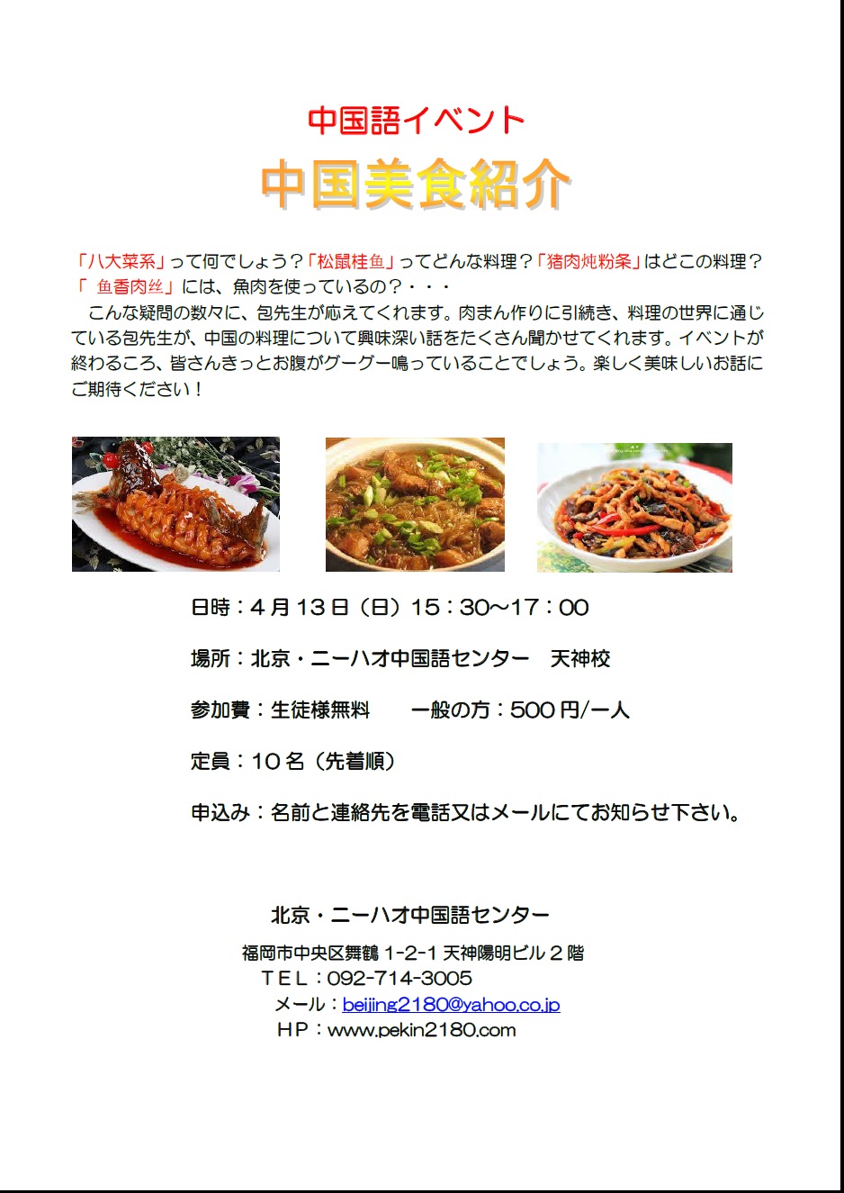 終了!中国美食紹介 2014.04.16 包先生の豊富な料理の知識を、存分に披露して頂きました。 その後「突然の火鍋の会」へ続きました…。 たくさんの方のご参加ありがとうございました。 北京・ニーハオ中国語センター 福岡市中央区舞鶴1-2-1天神陽明ビル2階 TEL :092-714-3005 mail:pekinnihao2180@yahoo.co.jp お問い合わせ 前の記事へ次の記事へ News一覧