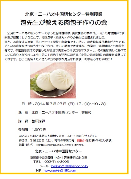 終了!包先生が教える肉包子作りの会 2014.03.24 満員御礼で、大盛況のうちに終了しました。 詳細は、写真満載のブログをご覧ください。 http://ameblo.jp/beijing2180/entry-11803542325.html 北京・ニーハオ中国語センター 福岡市中央区舞鶴1-2-1天神陽明ビル2階 TEL :092-714-3005 mail:pekinnihao2180@yahoo.co.jp お問い合わせ 前の記事へ次の記事へ News一覧