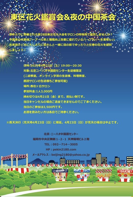 数年ぶりに開催される第28回東区花火大会をサロンの特等席で鑑賞しませんか?中国茶の代表格プーアール茶と睡眠向上効果に優れているハーブティーを美味しいお茶請けと共に久しぶりに皆さんと一緒に目の前でゆったりと圧巻の花火を鑑賞しましょう!