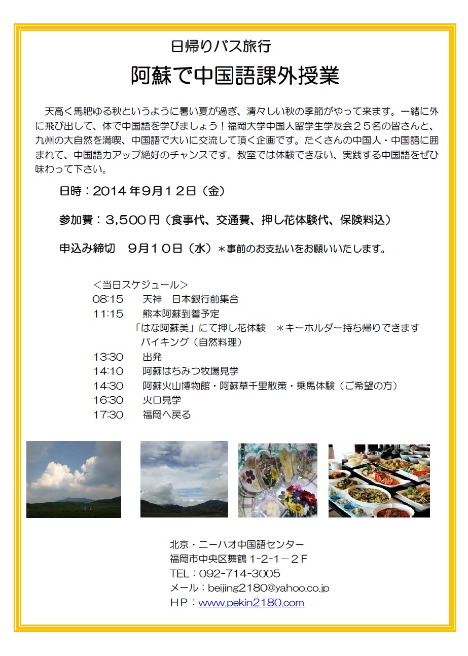 九州の大自然を満喫、中国語で大いに交流して頂く企画です。たくさんの中国人・中国語に囲