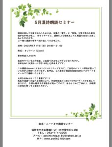 先生の漢詩への溢れる情熱により、予定時間通りに終了できないケースが多発しております。 今回も延長する可能性が高いですので、あらかじめご了承の上、お時間に余裕を持ってご参加ください。