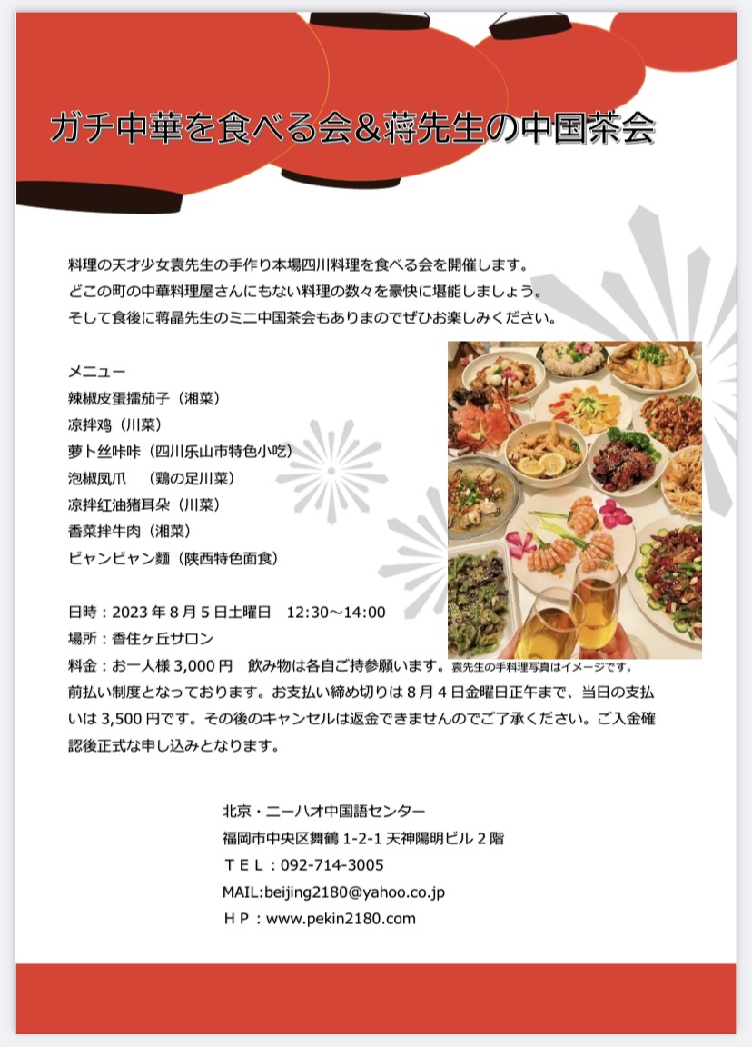 料理の天才少女袁先生の手作り本場四川料理を食べる会を開催します。