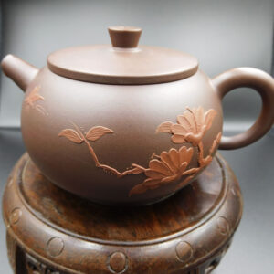 立体的な花と蝶に彩られた豪華絢爛な紫砂壺は、見ているだけも楽しめる逸品です。