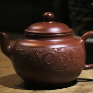 おめでたい赤の「紫砂赤泥壺」の表面には縁起物の龍が二頭彫刻され、さらに裏面には漢詩が彫刻されています。